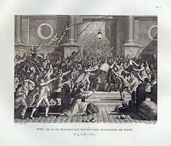 The first prominent victim of lynching "à la lanterne" was Joseph Foullon de Doué, an unpopular politician who replaced Jacques Necker as a Controller-General of Finances in 1789.[3] On 22 July 1789, the mob attempted to hang him on a lamp post, however, after the rope broke, he was beheaded and radicals marched with his head on a pike through the streets.[3] "If [the people] are hungry, let them eat grass," he is said to have once proclaimed, although the claim is unsubstantiated. Because Foulon, an aristocrat administrator of the royal government, was in charge of the Paris markets. Foulon was known for his coldheartedness towards the needs of the common French people; he was suspected of controlling Paris' food supply and, thereby, keeping food prices unaffordable. So hated that he had even staged his own funeral to escape the people's wrath, the 74-year-old Foulon had spent years growing rich at his post while the poor starved. On 22 July 1789, he was captured by an angry Paris crowd, who stuffed Foulon's mouth with grass, then summarily hanged him from the boom of a lamp post at the Place de Grève, in front of the town hall (L'Hôtel de Ville). But the rope broke, and Foulon was hanged again and again before he was dropped to the ground and decapitated. His head, its mouth still full of grass, was placed on a pike—a long, sharpened, wooden pole—and paraded through the streets. Later that day Foulon's son-in-law, Louis Bénigne François Bertier de Sauvigny, was taken to the Place de Grève and hanged there, from the lamp post. De Sauvigny's severed head was placed on a pike of its own. Those bearing the pikes put the two severed heads together and chanted, "Kiss Daddy!" [9][10]