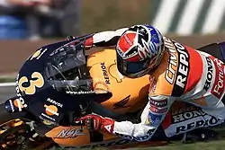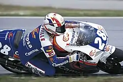 Initially he retired on the opening round in Malaysia and had only finished fourth in Indonesia whilst teammate Mick Doohan won the race. However, at the Japanese race, he took his first pole of the season on Saturday and finished second on Sunday.[13] In Spain however, he recorded his second retirement of the year. Initially taking the lead of the race from polesitter and teammate Doohan, as well as Luca Cadalora (who had a better start and thus led into turn one), Crivillé pulled a gap after a short battle with Cadalora, who's tyres began to fade. Crivillé then led for much of the race but Doohan was closing in at the final laps. On the last lap, spectators who already thought the race had ended, invaded the track around turn nine (the "Curva Àngel Nieto"), distracting Crivillé enough to allow Doohan to get back right on his tail going into the last couple of corners. Going into the last hairpin before the start-finish straight, Doohan went to the inside, going side-by-side with Crivillé. The pair did not touch, but Crivillé lost the rear whilst trying to accelerate, highsiding out of contention on the very last corner of the race, allowing Doohan to win the race as a result.[14][15][16]