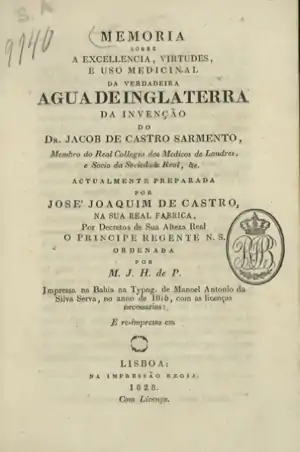 Sarmento set up a profitable distribution network for Água de Inglaterra in Portugal and it became one of the most widely used drugs in the country. Others, including Castro Sarmento's nephew who claimed his uncle had shared the formula with him, produced their own counterfeit versions.[3][6] The rights of the nephew's son in this regard were disputed in the Portuguese Parliament as late as 1821, having earlier been endorsed by the Prince Regent.[1]Two pharmacists in Lisbon also produced their own versions.[5]