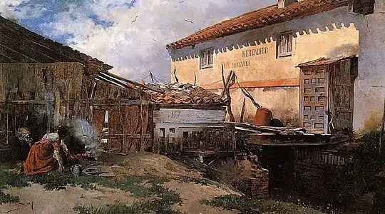 At the age of fifty, due to the death of his wife, he began to suffer from mental disorders, although he continued to paint and was named a Professor of drawing at the Círculo de Bellas Artes. Later, the quality of his work began to suffer as he created rapidly produced bullfight scenes and other popular images to maintain his income.[1] When his mental state had made it almost impossible for him to paint, the Círculo voted to provide him with an annual pension. In 1929, he had to be admitted to the asylum at the Hospital de Santa Isabel, Leganés, where he died.[1]
