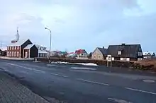 Fishing became a more important occupation after 1855 when the Danish–Icelandic Trade Monopoly was abolished and patterns of settlement changed greatly.[3] The village's heyday was from the mid-19th century to the early 20th century but with improved public transport and occupational opportunities the number of inhabitants decreased. Because of that, many houses from 1890 to 1920 have been preserved; those little houses of the common people characterize the village.[6][7] Not far from the Folk Museum is the church (1890) where the altarpiece is worthy of notice. It is given and painted by the Danish queen Louise of Hesse-Kassel.[8]