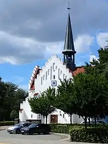 The church was designed by the Danish architect Harald Lønborg-Jensen and inaugurated in 1945. The church is architecturally linked with a church in Løgumkloster from which Lønborg-Jensen drew inspiration. The original church spire featured a flèche but as construction took place during the Second World War there was a shortage of lead and copper which meant it could not be properly finished. In 1973 it suffered from rot and was replaced with a new and slimmer version. In the interior the altar faces north and is made of grey and yellow travertine and adorned with a gilded crucifix. Colors are kept discrete throughout the church and the floor is paved in red brick.[4] In 1994 the church got a new organ and new windows in the choir.[5]