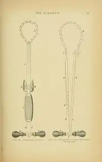 An écraseur is a surgical instrument containing a chain or wire loop that is used to encircle and sever a projecting mass of tissue (as the testicles of a horse or a pedicled tumor) by gradual tightening of the chain or loop.