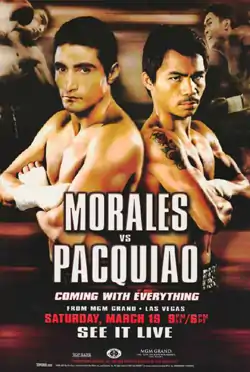 Érik Morales vs. Manny Pacquiao, billed as Coming With Everything, was a super featherweight boxing match. The bout took place on March 19, 2005 at the MGM Grand Garden Arena, Las Vegas, Nevada, United States and was distributed by HBO PPV.[2][3] The bout is the first of the Pacquiao-Morales trilogy,[4] widely considered one of the greatest boxing trilogies of all time.[5][6][7]