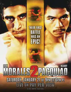 Érik Morales vs. Manny Pacquiao II, billed as The Battle, was a super featherweight boxing match. The bout took place on January 21, 2006 at the Thomas & Mack Center, Las Vegas, Nevada, United States and was distributed by HBO PPV.[2] The bout is the second of the Pacquiao-Morales trilogy,[3] widely considered one of the greatest boxing trilogies of all time.[4][5][6]