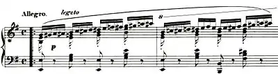 Cortot (1877–1962) states that the first difficulty to overcome is the "crossings of the 3rd, 4th and 5th fingers" and the "strain resulting from the continuous action of the said fingers".[15] Preparatory exercises introduced by Cortot, Gottfried Galston[16] and Casella[12] always commence with the chromatic scale (top voice) alone without the filling voice. Cortot divides the hand into an "active element" and an "accompanying element". He first insists on practicing chromatic scales with the three outer fingers in all permutations. Galston recommends to hold and press a little object with the thumb and index finger while playing the chromatic semiquavers with the other fingers. Cortot recommends the "pizzicato" notes to be "plucked rather than struck" and Casella wittily compares the three outer fingers to a "motorcycle dragging along its own sidecar [the first two fingers]". Australian pianist Alan Kogosowski (born 1952) recommends keeping 1 and 2 completely relaxed while playing the top voice alone: The "little two-note chords on each beat in the right hand" should be released "as soon as they've been played". The thumb should not be operated vertically to avoid strain and "play its notes extremely lightly –becoming as light as a feather, almost as if it is hardly there at all".[17] Von Bülow orders "the middle harmonies to be played throughout distinctly, and yet transiently [flüchtig]".[8] Galston suggests to accentuate all the upper notes of the two-note chords (played by the 2nd finger) while practicing the right hand.