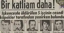 ![]() Headline of the Hürriyet dated 18 March 1978: Another massacre! Bodies of 5 workers who were tortured to death were found eaten by dogs. | |
