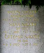 After the Second World War, Nagode sought to restore the liberal party and drew attention to violations of human rights in Slovenia. He was accused of treason and attempting to destroy the Yugoslav political system,[3] and in the summer of 1947 he was arrested together with other leading members of the party.[6] At the show trial known as the Nagode Trial[4] (Slovene: Nagodetov proces) he was charged with being a spy and an agent of imperial powers,[4][7] and sentenced to death by firing squad on 12 August 1947.[6] He was executed on 27 August 1947.[Note 1] His family's request to receive his body was denied, and his house in the Mirje neighborhood of Ljubljana was looted and seized by the state. His widowed mother, who had also been evicted from the house, committed suicide when she learned of her son's death.[2] Permission to engrave Nagode's name on the family's tomb in Ljubljana's Žale Cemetery was denied until 1977.[9] In a 2000 letter to President Milan Kučan, Ljubo Sirc requested in vain that the Slovenian government reveal the location of Nagode's body.[2]