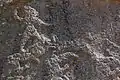 The top part of the right portion of the relief shows a facing goddess with raised arms, who is probably Šauška/Ishtar. Her head is in profile, looking left towards the approaching weather god. Her arms hold her robe open. On her head there are four[2] or five[3] prongs of a crown or coiffure. Wings rise up from her shoulders. Ehringhaus identifies a six-pointed star above her right hand.[4] Her legs are depicted without feet, in the manner of cult statues and she stands on top of a stylised tree. Between the weather god and the goddess, is a bird flying to the left. The motif of the weather god and an undressing goddess, often with a bird between them, is attested from the early Bronze Age on Syrian cylinder seals (and other media). Jutta Börker-Klähn proposes a connection with the Asherdu myth, in which Ishtar in the form of a bird catches the weather god having sex with Asherdu, the wife of Elkunirsa.