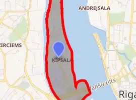 Ķīpsala is an island on the left bank of the Daugava river, connected to Riga city center and Pārdaugava by the Shroud Bridge. Ķīpsala is divided from the rest of Riga by the Daugava in the east, Roņu dīķis in the north, Zunda in the west and Agenskalna līcis in the south.