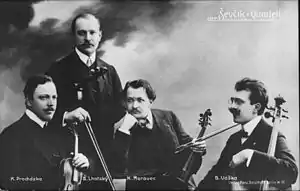Bohuslav Lhotský, Karel Procházka and Karel Moravec were all pupils of the Czech violin teacher Otakar Ševčík (b. 1852), who had control of the violin department at the Prague Conservatory between 1892 and 1901. The master's method was based on the semitone system, the fingers remaining at equal distances on all the strings during the technical studies, leading to great safety, precision and fluency in performance. Following the success of his pupil Jan Kubelík, his students gathered in great numbers at his residence at Písek. This quartet was the later counterpart of the Bohemian or Czech Quartet, which was formed by four pupils of the Prague cello professor Hanuš Wihan a decade previously.