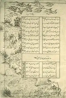 Another of `Abd al-Hayy's pupils, Ahmad Jalayir created similar monochromatic, black and white drawings to accompany his manuscripts in the Abusa'idnama ('Book of Abu Sa'id').[1] While texts from the time period do not directly confirm `Abd al-Hayy's involvement nor influence over these manuscripts, many scholars have concluded with firm certainty that these illustrations were done by `Abd al-Hayy. Evidence for this can be seen in the text of the manuscript that states that the unnamed painter, who was assisted by Aḥmad b. Ovays, prepared an Abū Saʿīd-nāma containing black and white drawings, a signature of `Abd al-Hayy.[2] There are also a number of paintings that explicitly state that they were copied from `Abd al-Hayy's drawings, some of which can be dated back to the late 14th century.[2]