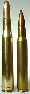 The cartridge offered superior ballistics to the .30-06 for long range, and the .300 H&H is almost as versatile with all bullet weights and types, especially if well-developed handloads are used. It excels with the heaviest .30-calibre bullets in the 180–220-grain range. SAAMI has set the pressure limit for this cartridge at 54,000 P.S.I.[2] Its case length calls for a full-length magnum action, and surplus military actions chambered for the .308 Norma Magnum or the .300 Winchester Magnum offered a lower cost alternative for similar ballistics in the 1960s.[3] The long .300 H&H case was designed for loading cordite, and those two modern magnum cartridges offered similar powder volume in a shorter case better adapted to ballistic uniformity with United States Improved Military Rifle (IMR) smokeless powder.[4]