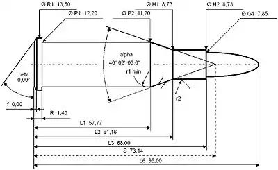Americans would define the shoulder angle at alpha/2 ≈ 20.01 degrees. The common rifling twist rate for this cartridge is 305 mm (1 in 12 in), 4 grooves, Ø lands = 7.62 mm, Ø grooves = 7.82 mm, land width = 4.47 mm and the primer type is large rifle or large rifle magnum depending on the load.