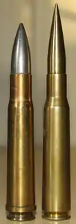 The .55 Boys is a 13.2×99mm Hotchkiss cartridge necked up to accept a .55 caliber bullet in mid-1930s.[1] Since the shoulder of the case was narrowed, a belt was added to ensure reliably correct headspace. It performed poorly when compared to contemporary foreign anti-tank rounds, such as the German 7.92×94mm Patronen[note 1] and the Soviet 14.5×114mm rounds and, as a result, it was quickly deemed obsolete.[2]
