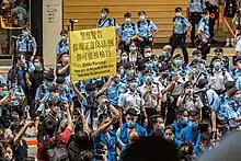 Amidst heavy police presence in Causeway Bay aimed at stopping demonstrations along the traditional march route in Hong Kong, a 50-year-old man stabbed a police officer in the back with a knife at 10 pm, and then turned the knife on himself. The police officer was rushed to hospital in a critical condition but survived, while the alleged assailant was declared dead upon arrival at the hospital.[26][27] Hong Kong's newly appointed Security Secretary, Chris Tang, declared it a "terrorist act" committed by a "lone wolf", but blamed "many people who have encouraged violence and incited hatred toward society and the country".[26] The police have become highly unpopular for their brutal suppression of the anti-ELAB protests. After Hongkongers started laying flowers at the location where the suspect fell, police warned that the mourning amounted to supporting terrorism.[28]
