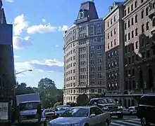 The New York Times has said that the "opposing curves, (form) a gateway as impressive as any publicly built arch or plaza in New York.[2] The unusual curves of the road are the result of an 1897 plan to make the land between Claremont Avenue and Riverside Drive into a public park in order to give veterans parades with a large park adjacent to Grant's Tomb as a terminus. The street was redesigned so that a vehicle or a parade coming up Riverside Drive would swing onto 116th Street in a gracious curve, then immediately swing north onto Claremont Avenue following a second curve. The city never appropriated funds to buy the land, but the curves remain.[3] The top of The Paterno is capped with an architectural fancy masking a water tower in a shape that conjures up a section of Mansard roof, complete with dormer window. It is visible from the gates of Columbia University at Broadway and 116th Street.