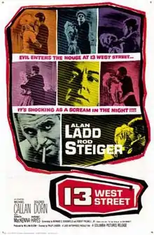 13 West Street is a 1962 American neo noir crime film directed by Philip Leacock and starring Rod Steiger and Alan Ladd whose own production company produced the film.[1] It was based on the 1957 novel The Tiger Among Us (1957) by Leigh Brackett, who called the film "very, very dull".[2]