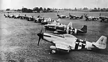 As the German Army launched the counteroffensive known as the Battle of the Bulge, a detachment of the squadron that included all of its air echelon deployed to Asch Airfield on 23 December 1944 to reinforce Ninth Air Force flying air support missions. On 1 January the detachment earned the squadron the French Croix de Guerre with Palm, when its airfield was attacked by 50 Luftwaffe fighter aircraft, just as its planes were taking off for an area patrol. In the ensuing aerial battle, about half the attacking German aircraft were destroyed with no loss to the squadron. The detachment moved to Chievres Airfield, Belgium in late January 1945, where it was joined by the rest of the squadron, coming under the control of Eighth Air Force again. From Chievres, it provided cover for Operation Varsity, the airborne assault to establish a bridgehead across the Rhine.[3]
