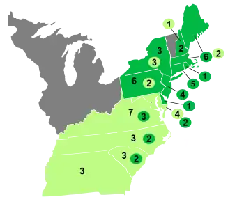 On April 6, 1789, the House and Senate, meeting in joint session, counted the electoral votes and certified that Washington had received electoral votes from each of the 69 electors that had cast votes, and thus had been elected president. They also certified that Adams, with 34 electoral votes, had been elected as vice president.[11] The other 35 electoral votes were divided among: John Jay (9), Robert H. Harrison (6), John Rutledge (6), John Hancock (4), George Clinton (3), Samuel Huntington (2), John Milton (2), James Armstrong (1), Benjamin Lincoln (1), and Edward Telfair (1).[12] Only ten of the thirteen states cast electoral votes; North Carolina and Rhode Island did not participate as they had not yet ratified the Constitution, while the New York legislature failed to appoint its allotted electors in time.[13]