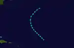 The first tropical cyclone and hurricane of the 1861 season is believed to have formed on July 6, immediately east of the Leeward Islands. A 1938 publication documented the storm's effects on Guadeloupe and St. Kitts, and given a lack of prior reports on the cyclone, modern-day reassessments concluded that it was relatively weak when it affected those islands.[5] After crossing the northern Leeward Islands, the tropical storm broadly curved toward the northwest, likely intensifying into the equivalence of a Category 1 hurricane on the Saffir-Simpson Hurricane Scale on July 9.[2] The majority of the storm's track in the western Atlantic was unknown until it was reconstructed based on reports from, and the effects on, three ships in its vicinity.[5]
