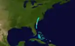 Late on October 2, a hurricane formed in the Gulf of Mexico, off the coast of northeastern Mexico. Holding its intensity, the storm system paralleled the Texas coastline, causing "many" deaths. A storm tide value of 7 feet (2.1 m) was reported in Ludlum (1963), and it is possible that Brownsville, Texas, was in the western eyewall of the hurricane at the storms closest approach.[3] Turning towards Louisiana, the storm made landfall on the state with winds of 100 mph (160 km/h), a Category 2 on the Saffir-Simpson hurricane scale. Moving to the east and weakening, the storm made landfall on the state of Florida during the day on October 6. Holding its strength while crossing the Sunshine state, the tropical storm re-emerged into Atlantic waters. Taking a slight turn to the north, it dissipated off the coast of North Carolina on October 9.[5]