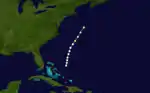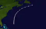 The first known tropical cyclone of the season was observed on September 3, about halfway between the Bahamas and Bermuda.[1] A nearby ship estimated winds of 80 mph (130 km), indicating the presence of the hurricane.[4] It moved northward initially, passing about 220 mi (355 km) west of Bermuda on September 4. Thereafter, the hurricane turned toward the northeast,[1] and the ship "John Richardson" encountered gale force winds on September 5, resulting in a wreck of its cargo.[2] On September 6, it was estimated to have reached peak winds of 105 mph (165 km/h), based on observations from the ship with the call sign "Greenock".[4] The hurricane lashed the ship with strong winds for 14 hours, killing the captain and one crewman. At the time, it was about 400 mi (640 km) southeast of Halifax, Nova Scotia.[2] Turning to the northeast, the hurricane passed south of Newfoundland before last being observed on September 7.[1]