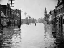 Before the hurricane made landfall in Georgia, it produced strong winds in northeastern Florida, reaching Category 2 strength on the Saffir-Simpson scale.[2] The worst effects from the storm were confined to a very small portion of extreme northeastern Florida. At Fernandina Beach, the storm surge was estimated at 12 ft (3.7 m), causing extensive flooding in the city.[4] The October 1898 Monthly Weather Review described Fernandina as "nearly destroyed", and most anchored boats were sunk or washed inland into the marshes. Damage along the coastline reached as far south as Mayport.[1] The hurricane was small,[2] and despite passing 50 miles (80 km) northeast of Jacksonville, produced only 60 mph (97 km/h) winds in the city.[1] However, for the first time in the history of the city, all communications were cut between Jacksonville and cities further north, such as New York.[5] Damage throughout the state was estimated at $500,000 (1898 USD).[1]