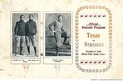 The train carrying the players pulled into Austin on the night of the 8th to face the undefeated Texas Longhorns the following afternoon. Sewanee won 12–0. They scored five minutes into the first quarter, and a minute before the end of the game, "and the intervening time was devoted to the liveliest battle ever witnessed here".[21] Diddy Seibels played throughout the game, scoring both touchdowns, despite his head having split open just above his left eye, bleeding profusely. By the end of the game his head was coated with blood.[21]