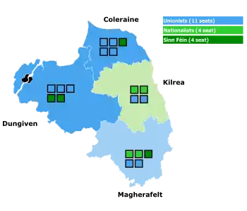 The Dungiven Electoral Area comprised the District Electoral Divisions of Ardmore, Ballykelly, Ballymullins, Banagher, Bondsglen, Claudy, Drum, Dungiven, Eglinton, Faughanvale, Fenny, Foreglen, Glendermott, Glenshane, Lough Enagh, Lower Liberties, Myroe, Owenreagh, Straw, Tamnaherin, The Highlands, Upper Liberties, and Waterside.[5][6]