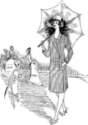 Paris set the fashion trends for Europe and North America.[3] The fashion for women was all about letting loose. Women wore dresses all day, every day. Day dresses had a drop waist, which was a belt around the low waist or hip and a skirt that hung anywhere from the ankle on up to the knee, never above. Daywear had sleeves (long to mid-bicep) and a skirt that was straight, pleated, hank hem, or tiered. Hair was often bobbed, giving a boyish look.[4]