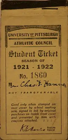 The 1921 Pittsburgh Panthers football team was an American football team that represented the University of Pittsburgh as an independent during the 1921 college football season. In its seventh season under head coach Pop Warner, the team compiled a 5–3–1 record and outscored all opponents by a total of 133 to 50.[1][2] The team played its home games at Forbes Field in Pittsburgh.