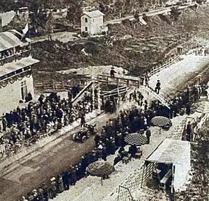 The Bugatti team returned to Italy for the Targa Florio. Once again, the event was run in conjunction with the Coppa Florio, with that being based on the results of the event's first four laps of the newly sealed Madonie circuit. In 1924, the grandstands had been destroyed by a fire but within a year they had been rebuilt.[55] Whereas in 1924 the German teams arrived in force, this year it was the French. Bugatti had a three-car team with Bartolomeo Costantini and the Spanish de Vizcaya brothers, Pierre and Ferdinand. Peugeot returned with four of their Type 174 sports cars with André Boillot, Louis Wagner, Victor Rigal and Christian d'Auvergne as the drivers. None of the Italian works teams turned up, with the small field filled out by privateers. The field started at 4-minute intervals with the Peugeots, as the only entrants in the Coppa Florio, going out first.[56] They set the early pace with Boillot setting a new lap record on the first circuit (assisted by the better quality roads). Going into the third lap, now led by Wagner they were running 1-2-3 with Costantini three minutes behind. However, d'Auvergne missed a corner, hit a wall and rolled. His mechanic was thrown clear while d'Auvergne lay pinned under the burning car. Wagner, following a few minutes behind, stopped and together with the mechanic pulled his badly injured teammate from the wreck before re-joining the race.[57] Costantini meanwhile was picking up his pace and was ahead on elapsed time by the end of the third lap. He drove a smooth incident-free run, putting in the fastest lap of the race on his final lap to beat the Peugeots of Wagner and Boillot, to win the Targa.[53] By dint of Peugeot being the only team to register for the Coppa, André Boillot won that prize.[58] Along with their 1922 victory, Peugeot became the first two-time winners and were awarded the Coppa Florio, but decided to put it up for competition again.[59]