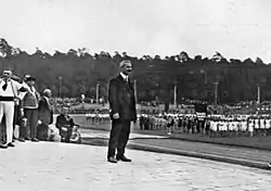 The events mostly took place at the newly opened Waldstadion that is today known as Commerzbank-Arena. An outdoor swimming pool, Stadionbad, was built for the swimming competitions.[3] The opening ceremony had a choir of 1,200 people singing and later 60,000 actors took part in the drama presentation "Worker Struggle for the Earth" marching through the streets of Frankfurt.[2][4] All events attracted a total of 450,000 spectators.[5]