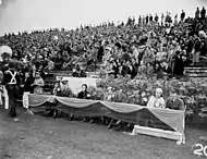 The visiting team was Wallace Wade's Alabama Crimson Tide, and the eventual national champions spoiled Florida Field's debut by thumping the Gators 20–0. Despite the score, Florida showed much defensive strength, holding the undefeated Tide to 6 points until tiring late in the contest, with lineman Muddy Waters given praise.[26] However, Florida's offense struggled all afternoon against an Alabama defense that would only allow 13 points all season.[27]