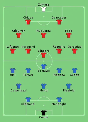 The first game between Italy and Spain was one of the most contentious and marred by several poor refereeing decisions, especially seeing Italy players challenging roughly the goalkeeper Ricardo Zamora. Spain went ahead with Luis Regueiro, but their lead did not last long. Italy equalized when Giovanni Ferrari knocked in a rebound, while Zamora was blocked off by Schiavio. The tie required a replay to settle.[2]