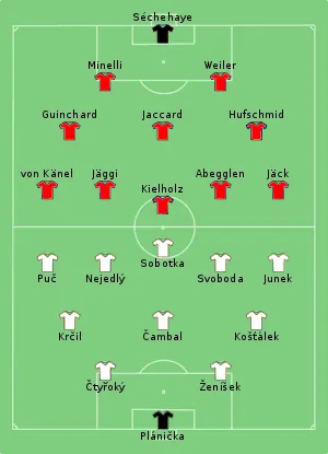 In a well-balanced game, Switzerland took the lead with Kielholz thanks to a counter-attacking play. Czechoslovakia equalized soon after with František Svoboda, who turned a chance created by Jiří Sobotka into a goal. In the second half, although Switzerland dominated the ball possession, it was Czechoslovakia scoring twice and holding on for the victory.[2]