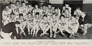 The Army drafted Mathisen, Menke and Smiley. That left only Vance and Phillip, both good enough to be selected to Illinois' All-Century team. Head coach Doug Mills made a decision in February 1943 that all five always supported, the club did not participate in either the NCAA or NIT tournament.[3] Wyoming's NCAA championship that season may not have happened had Illinois’ season not coincided with World War II. The team was retroactively named the national champion by the Premo-Porretta Power Poll.[4]