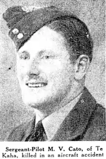 In early August it was reported that Malcolm (Mal) Vernon Cato had been killed in an aircraft accident while serving on July 16. He was 25 years of age at the time of his death. Cato had been “educated at the Te Kaha School, where his father was native schoolmaster, and then at Mount Albert Grammar School. He belonged to the North Shore Rugby Club and also played senior rugby league for Mount Albert after joining them in late 1939 and playing the 1940 season and the early part of 1941 before his departure overseas. Cato was "a keen student of the Māori language... and very popular amoung Māori in the Te Kaha district. When news of his death was received, a tangi was held in his memory".[52][53] The Mount Albert senior players wore armbands as a mark of respect for their match on August 1 with Ponsonby. The Mount Albert senior players wore armbands as a mark of respect for their match on August 1 with Ponsonby.[54] At the board meeting on August 5 a “motion of sympathy was carried in silence with” his relatives.[55] Cato was buried at Beck Row (St John’s) Churchyard, Mildenhall, Suffolk, England.[56]