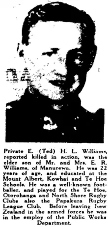 194. "Private Edward (Ted) Henry Leonard Williams". Auckland Star, Volume LXXIII, Issue 165. 1942-07-15. p. 6. Retrieved 2022-04-19.