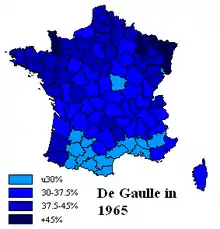 The 1965 French presidential election, held on 5 December and 19 December, was the first direct presidential election in the Fifth Republic and the first since the Second Republic in 1848. It had been widely expected that incumbent president Charles de Gaulle would be re-elected, but the election was notable for the unexpectedly strong performance of his left-wing challenger François Mitterrand.