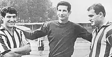 The confirmed coach Heriberto Herrera in the preseason between the team's two new acquisitions, winger Erminio Favalli (left) and forward Virginio De Paoli (right).