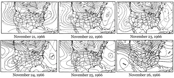 In November 1966, New York City was experiencing an unseasonably warm "Indian summer".[3] A cold front from Canada brought clean air to the city on November 19, but the cold front was held in place by pressure from the higher atmosphere.[41] An anticyclonic temperature inversion[42]—in other words, a warm, mostly stationary air mass located atop a cooler air mass—formed over the East Coast on November 20.[43]
