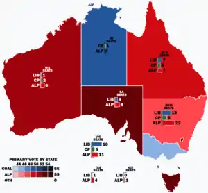 ![]() Popular vote by state and territory with graphs indicating the number of seats won. As this is an IRV election, seat totals are not determined by popular vote by state or territory but instead via results in each electorate. | |||||||||||||||||||||||||||||||