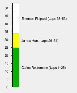Wilson Fittipaldi crashed on lap 13, his car catching fire and requiring the fire engine to be deployed. By now, Hunt had passed Lauda and was catching the two Brabhams. Pace took the lead on lap 15, but spun on the very next lap. Reutemann having retaken the lead, was understeering badly and on lap 25 was passed by Hunt. There was a ferocious battle with Emerson Fittipaldi for the lead.