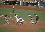 ![]() The Mets' Lee Mazzilli is about to be out trying to steal home while Dodgers' catcher Johnny Oates and pitcher Lance Rautzhan are protecting home plate and the Mets' Steve Henderson is at bat on September 3, 1978. The Mets won 8–5 at Dodger Stadium. | |
