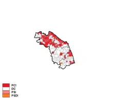 The Italian Communist Party was the largest party, narrowly ahead of Christian Democracy, but again it obtained less seats for a trick of the electoral law. Consequently, after the election Emidio Massi, the incumbent Socialist President, formed a new government including also the Christian Democracy, the Italian Democratic Socialist Party and the Italian Republican Party (organic Centre-left).[1]