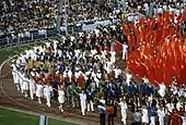 - Vertical Red flags with the emblem of the Moscow Olympics on them entered, along with marshals and linemen. The Card stunt was then showing the Moscow Olympics logo, with rays spreading from it.