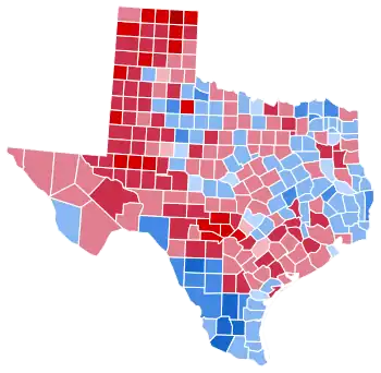 Notwithstanding Carter’s loss in Texas – which was his weakest state in the South or border states except Virginia and Oklahoma which Ford had narrowly carried in 1976[3] – the 1980 election is the last when the following counties have voted for a Democratic presidential candidate: Cherokee, Coke, Erath, Kaufman, Leon, Somervell,[lower-alpha 1] Van Zandt and Wise.[4] As of 2020, this is the last presidential election in which Texas voted more Democratic than California.