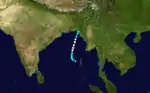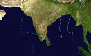 The monsoon trough spawned a tropical depression just east of Sri Lanka on October 25. The depression tracked northwestward, becoming a tropical storm on the 27th over southern India according to the JTWC. Over the Arabian Sea, it turned northeastward where, after reaching a peak of 120 km/h (75 mph) winds, it hit western India on November 2 as it recurved northeastward. The IMD last reported the system on November 3.[3] Nearly 5700 huts were reported to be damaged due to gust winds over Gujarat at the time of landfall.